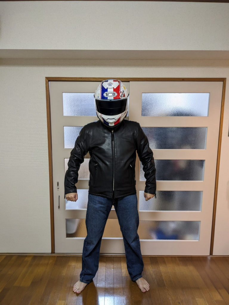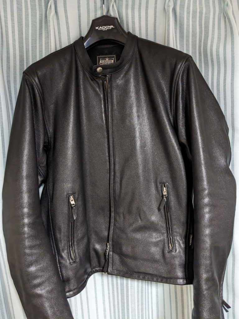 プロテクターを外せば普段着にも。少々重いですが、着てしまえばその重みも安心感。バチコーンとキメてお出かけしたいときに着て行っています。相棒も時々羽織っては、「私も革ジャン欲しいな…」とつぶやいています。やはり買うべきは「本物」だね。これからどのように育っていくか、楽しみです。