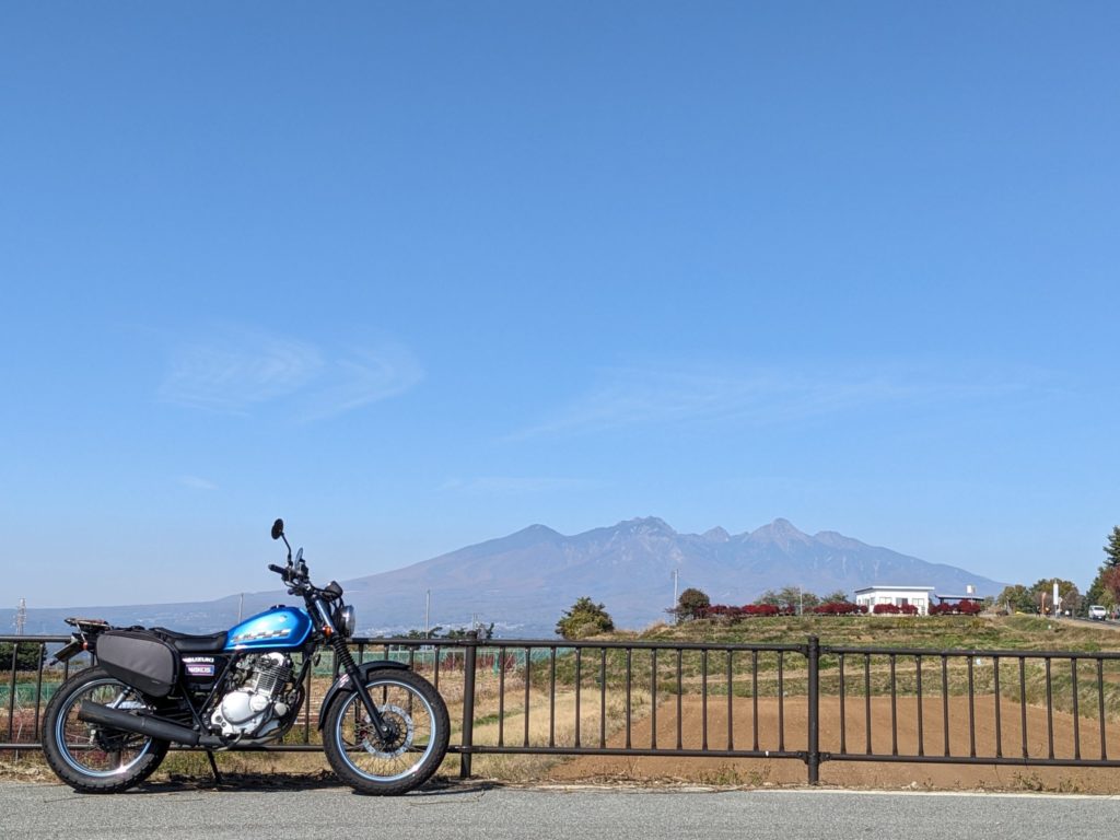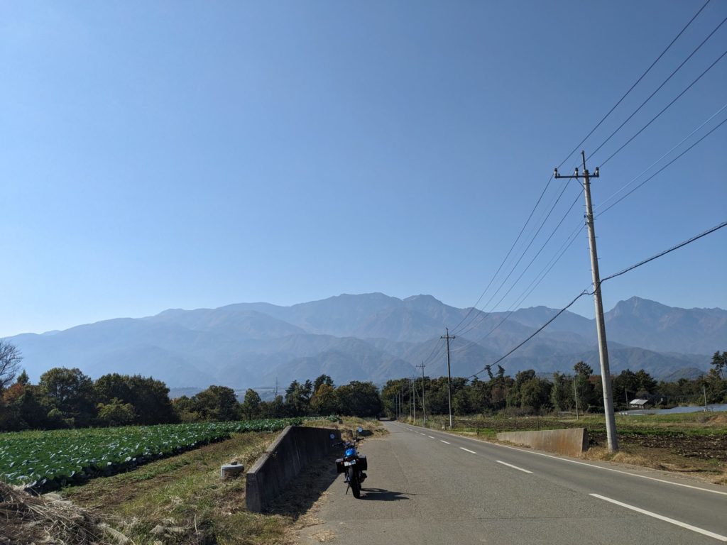 道の駅南きよさとに向けて北上していましたが、特に道の駅に用事がないので(←失礼)、そのまま八ヶ岳広域農道、通称レインボーラインへ。この道は最初は北に向かい、途中で盆地を横切るように西進していきます。かつてツーリング友達に「寄り道おじさん」と名付けられたほどの寄り道力を発揮して、絶景スポットを見つけては寄り道撮影。