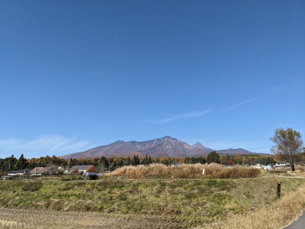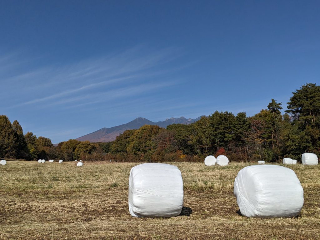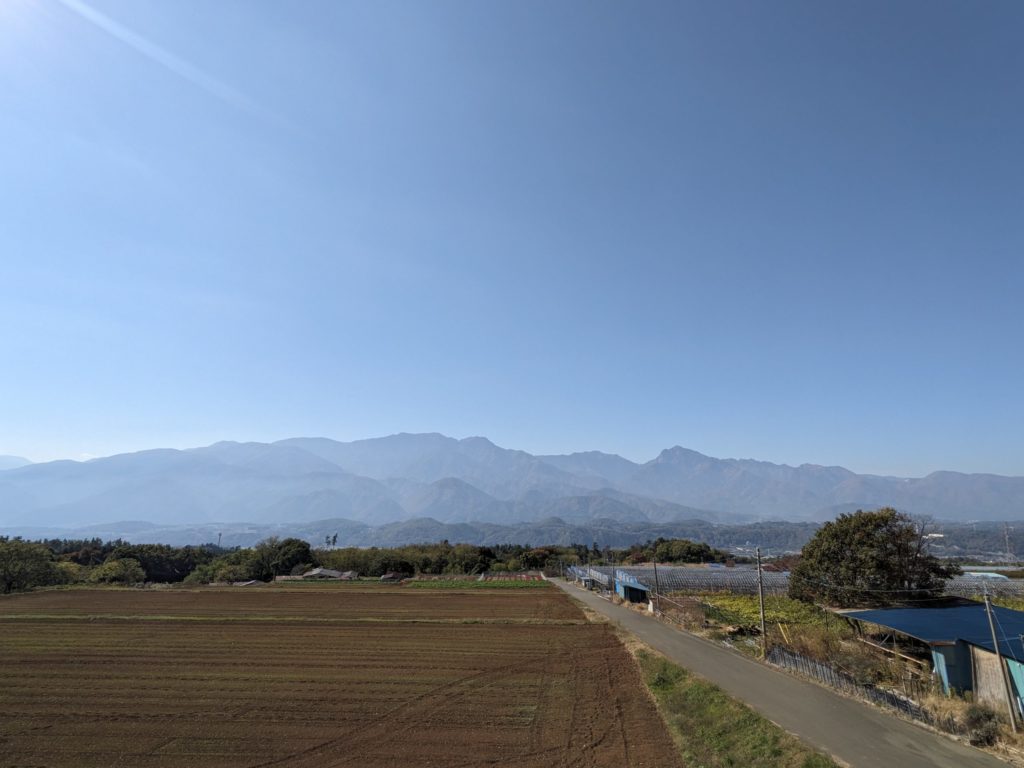 甲斐駒ヶ岳、八ヶ岳、茅ヶ岳が一度に見れる素晴らしい場所(地図)でした。夏には一面のひまわり畑になるんだとか。それも見てみたいけど、混みそうだな(笑)